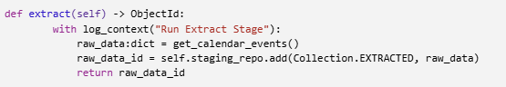 Extract calendar data using Google Calendar API and store the full JSON payload in MongoDB extracted collection using the StagingRepository