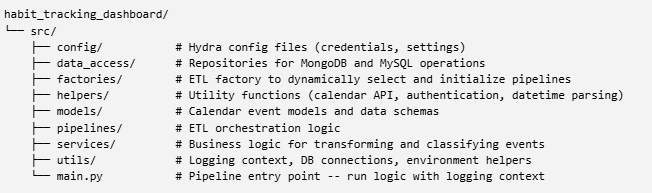 I built an ETL pipeline using Python, Google Calendar API, MongoDB, and MySQL to support habit tracking, weekly reflection, and long-term analysis in Tableau.